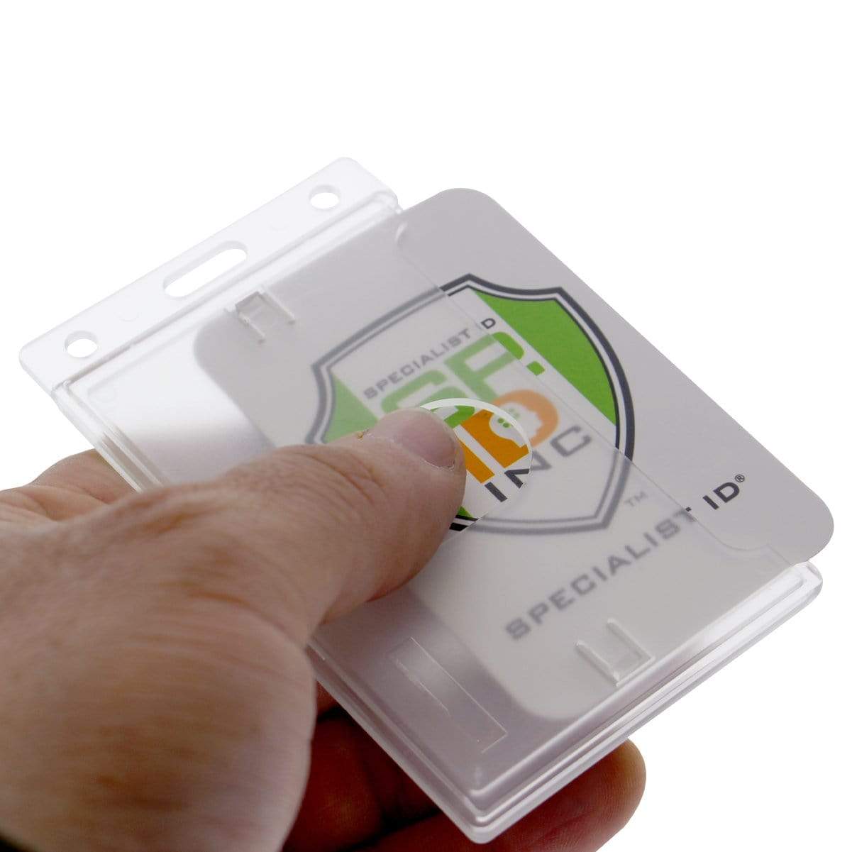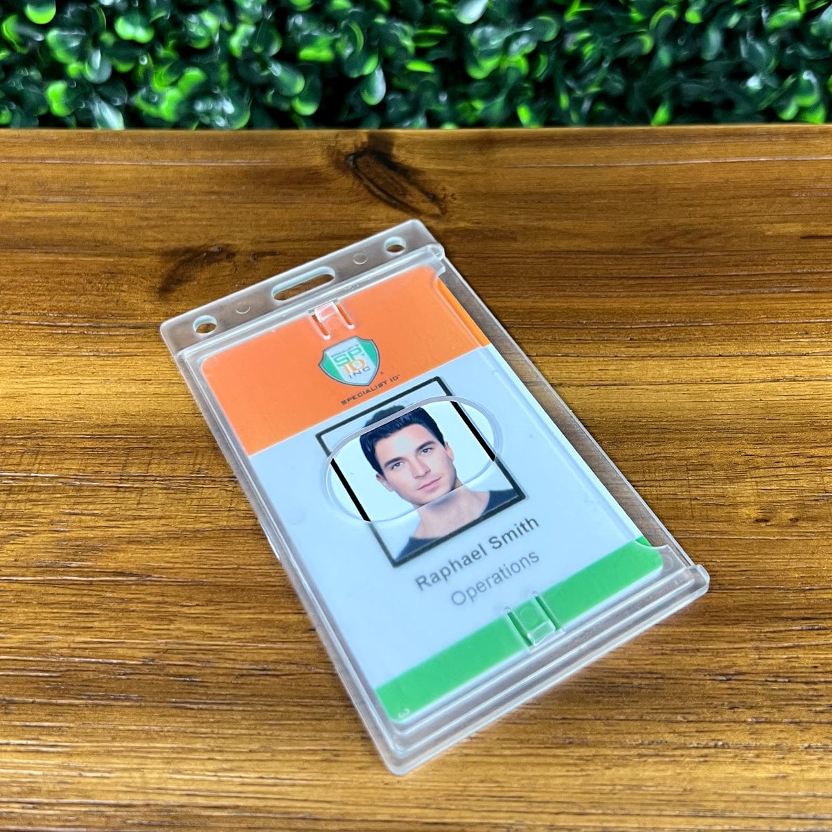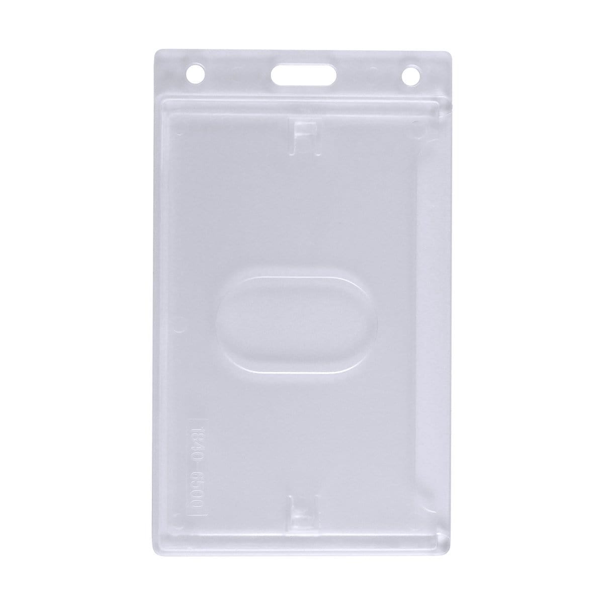 Meet our 1840-6500 - a hard plastic, clear frosted ID badge holder built for durability and convenience. This vertical, single-card holder fits one 30mil smart card or magnetic swipe card, including RFID, CAC, PIV, TWIC, TSA, and fuel cards. The side load design gives you easy access to swipe or show your card while protecting it from dust, lint, scratches, and bending, ensuring its longevity.