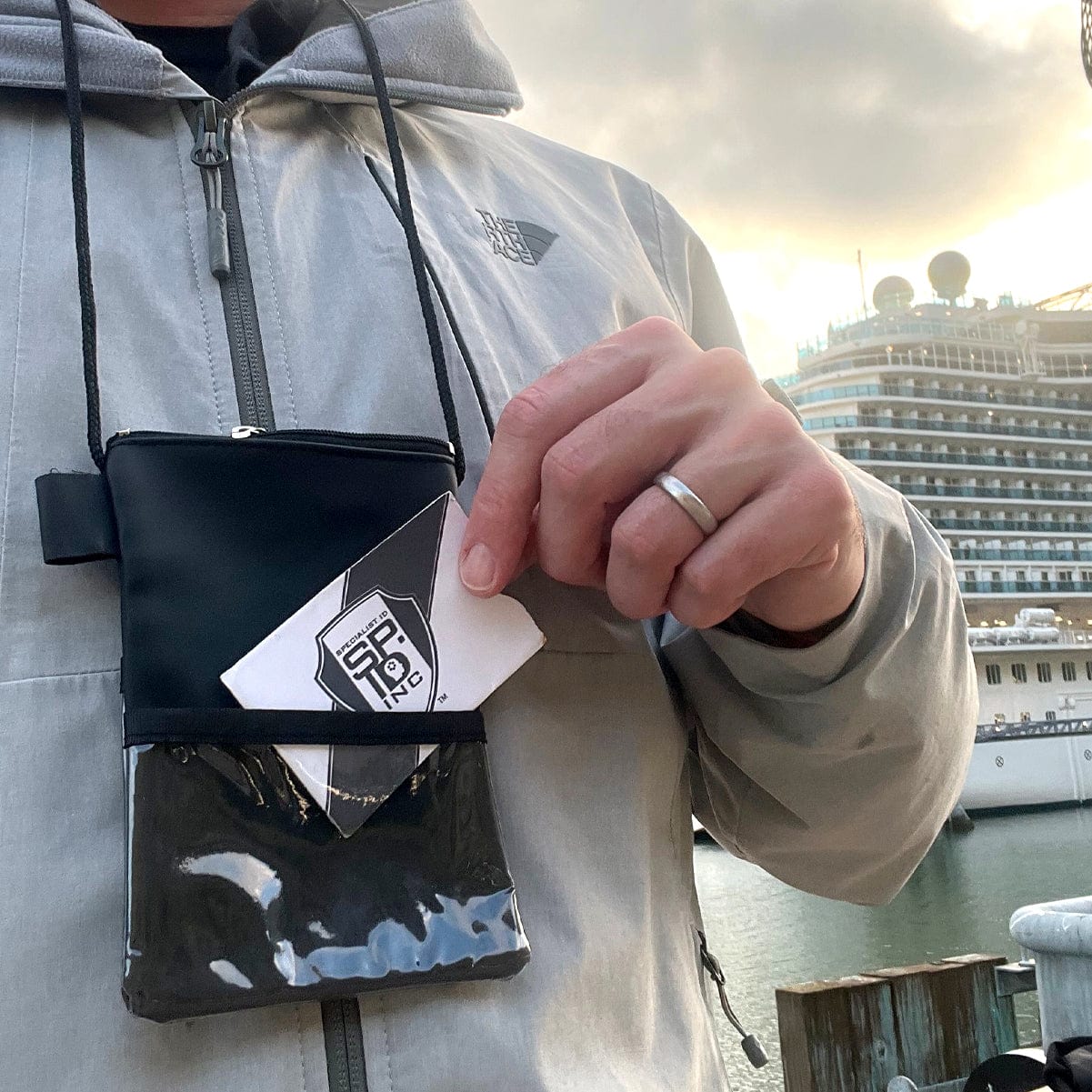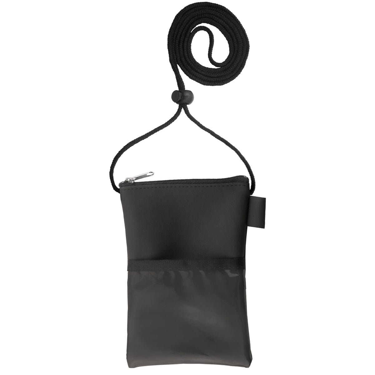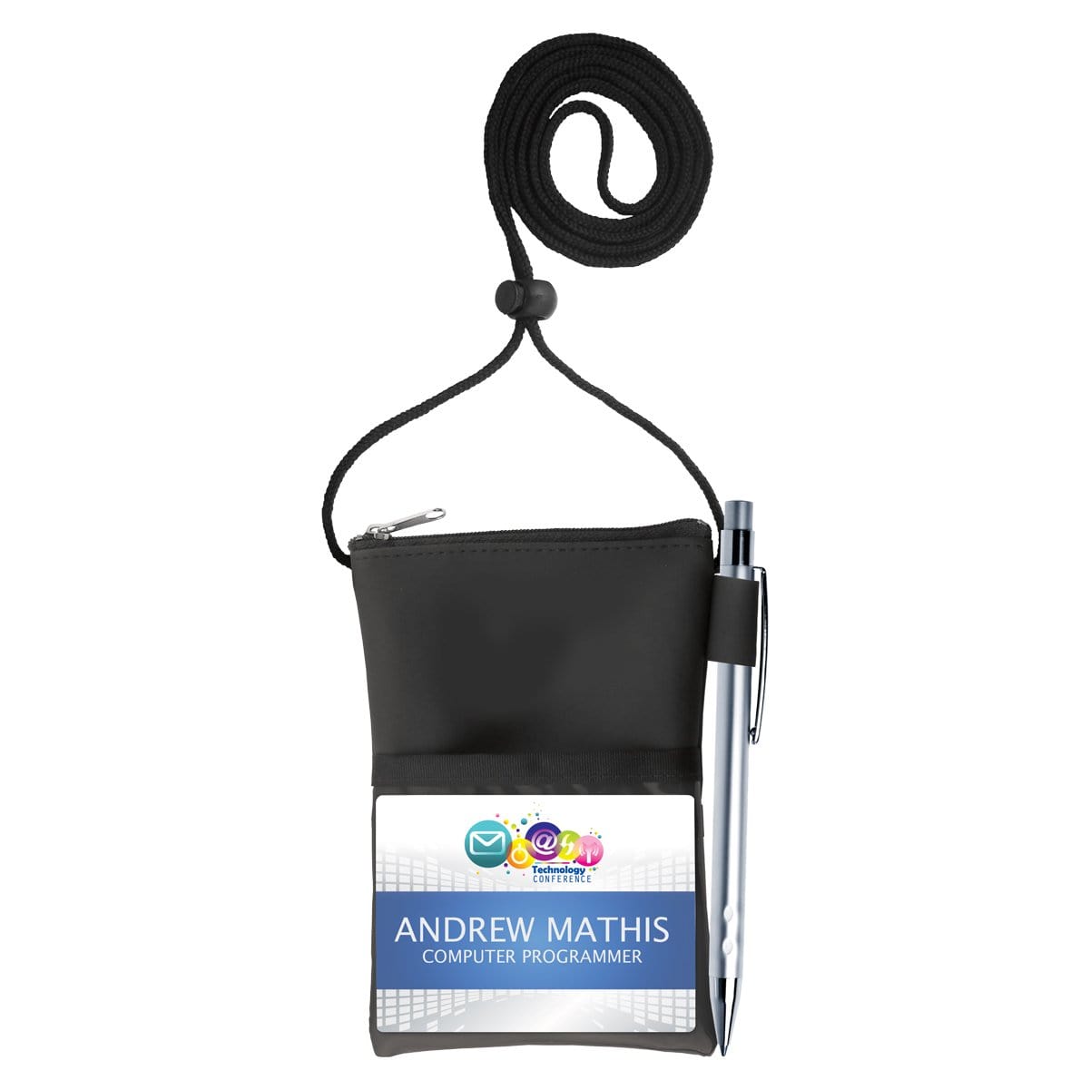 The black vinyl credential neck wallet with adjustable lanyard, zipper pouch and pen holder (CW-6-BLK) offers a sleek and convenient solution for carrying essential items at events, conferences, trade shows, sporting events, corporate meetings, expos and other busy outings. Crafted from durable black vinyl, this neck wallet combines style with functionality, ensuring that your belongings are secure and easily accessible. The adjustable lanyard allows you to customize the length to your preference, providing both comfort and a snug fit. With multiple compartments, including a clear front window for badges or IDs, a large zippered pocket for cell phone, cash, credit cards, maps, and small valuables - plus two smaller clear vinyl pockets for parking pass or business cards, this neck wallet offers efficient organization. An added side pen holder loop allows for easy access to any writing instrument.